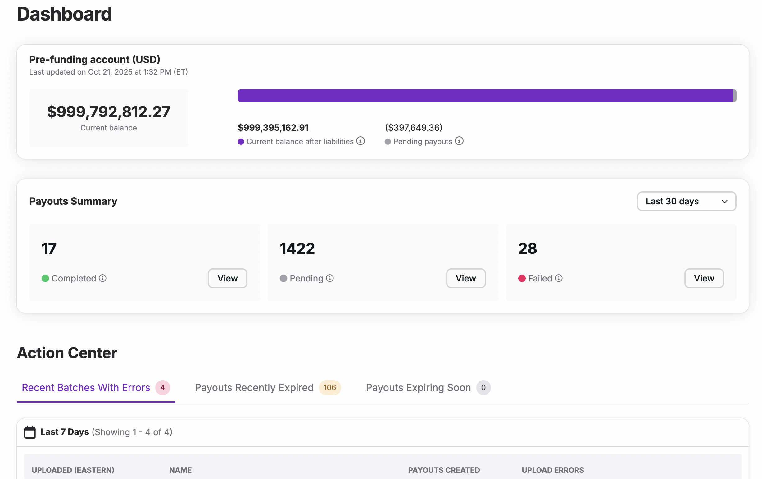 The Action Center provides visibility into batches and payouts that are immediately actionable and time sensitive.