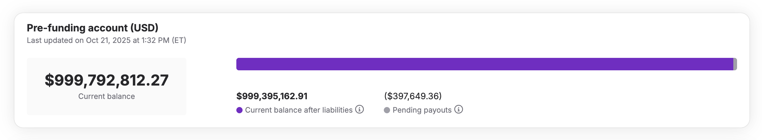 This section provides an easy way to view the projected balance in your pre-funding account (in USD) after accounting for the amount of pending payouts (the timestamp indicates when the balance was last updated). This section will also let you know if the total liabilities exceed the amount in the account or if the account has fallen below the threshold you set.